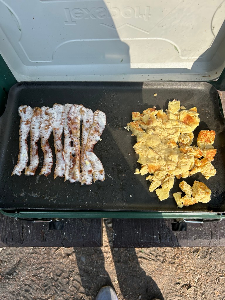 - While camping, and especially following a campsite strength workout via use of a gallon of water and 5 gallon water container, I needed to consume an appropriate amount of protein for breakfast.