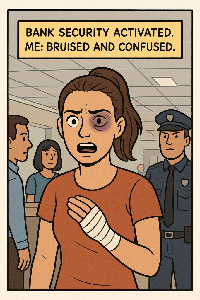 - After getting hit in the face one of these times, I need not have triggered bank security protocol upon trying to withdraw $200 with a black eye and athletic tape wrapped around my hand (because of a blister).