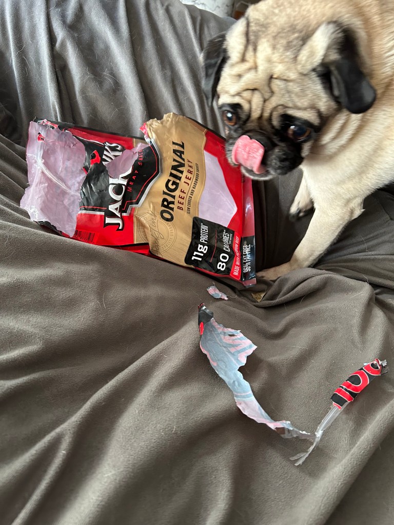 Scout found the beef jerky in Em’s room. Upon sending this photo to Em, she replied, “Bruh. This big back.”
