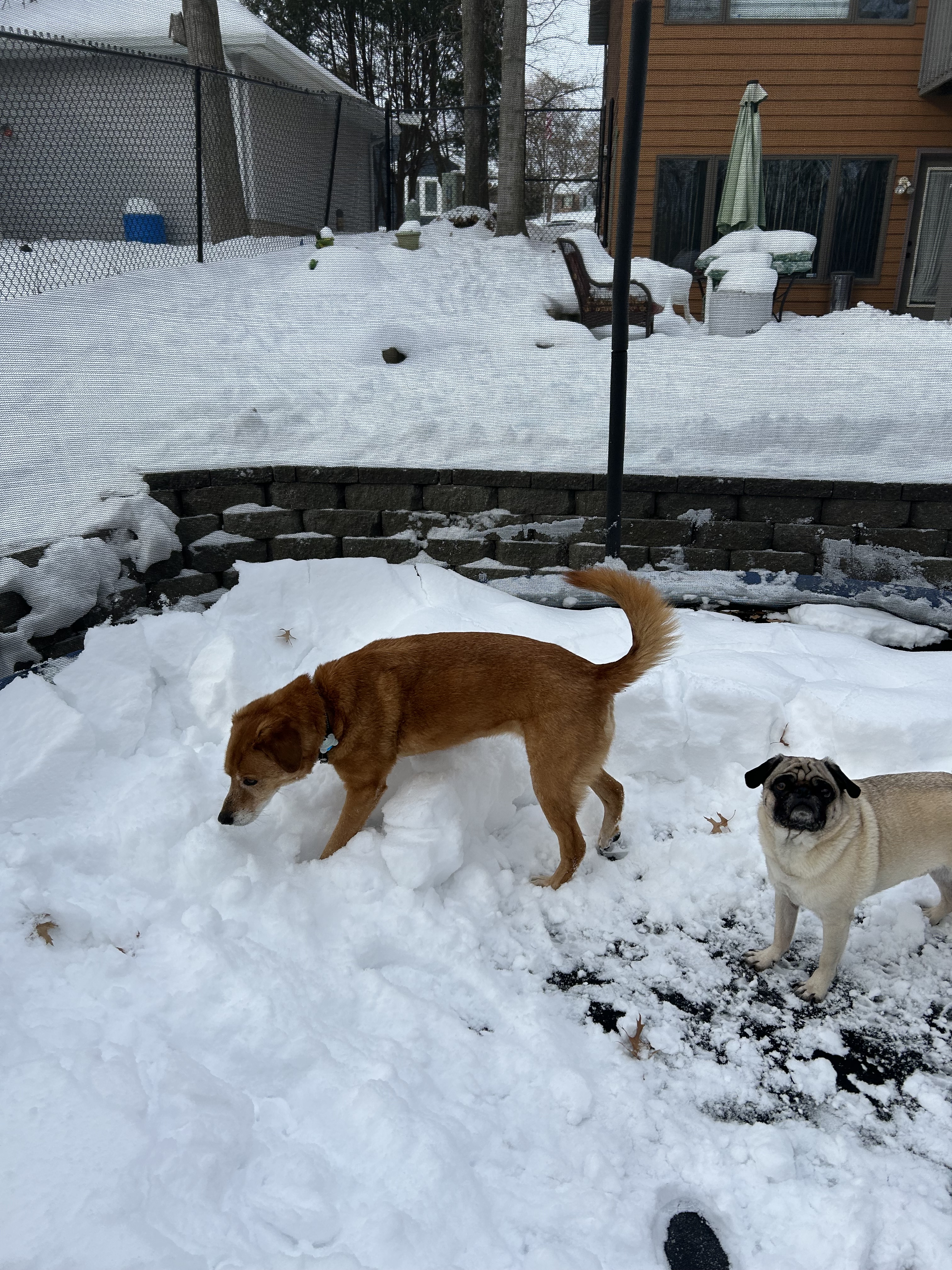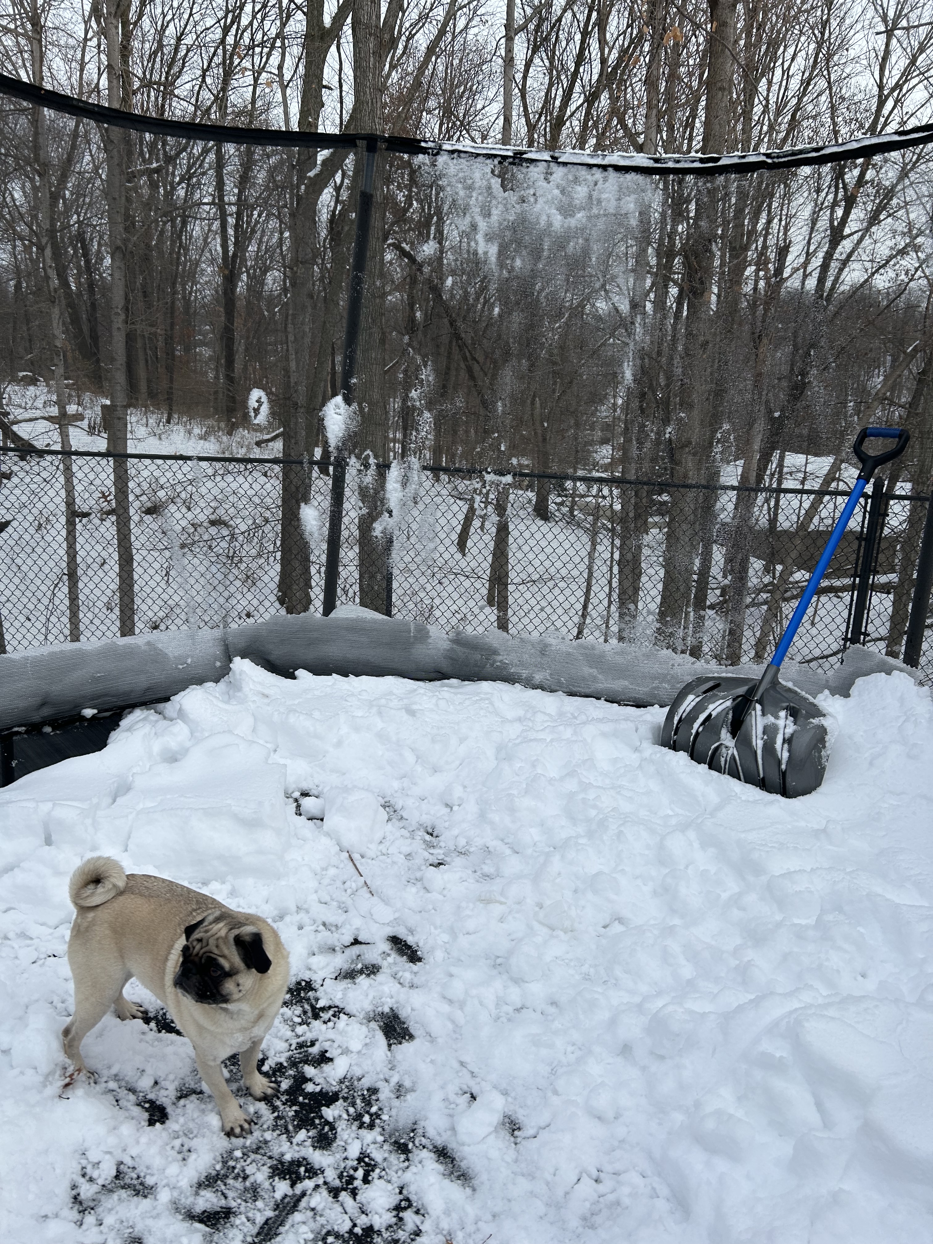 - I didn’t need 18″ of accumulated snow on the trampoline when the only method of snow removal is up and over. But, though they were in the way more than any semblance of assistance, I needed the company and love of dogs 🐶🐕🐕 as a welcome distraction from the shoulder workout.